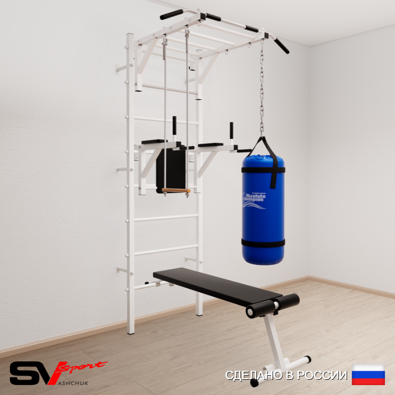 КОМПЛЕКТАЦИЯ: Шведская стенка Sv Sport усиленная (профиль вертикальных стоек 60 х 40 х 2 мм), Турник Sv Sport рукоход к ШС, Брусья Sv Sport к ШС, Скамья для пресса и жима Sv Sport к ШС, Трапеция, Цепь удлинитель 90см, Мешок боксерский 15кг.