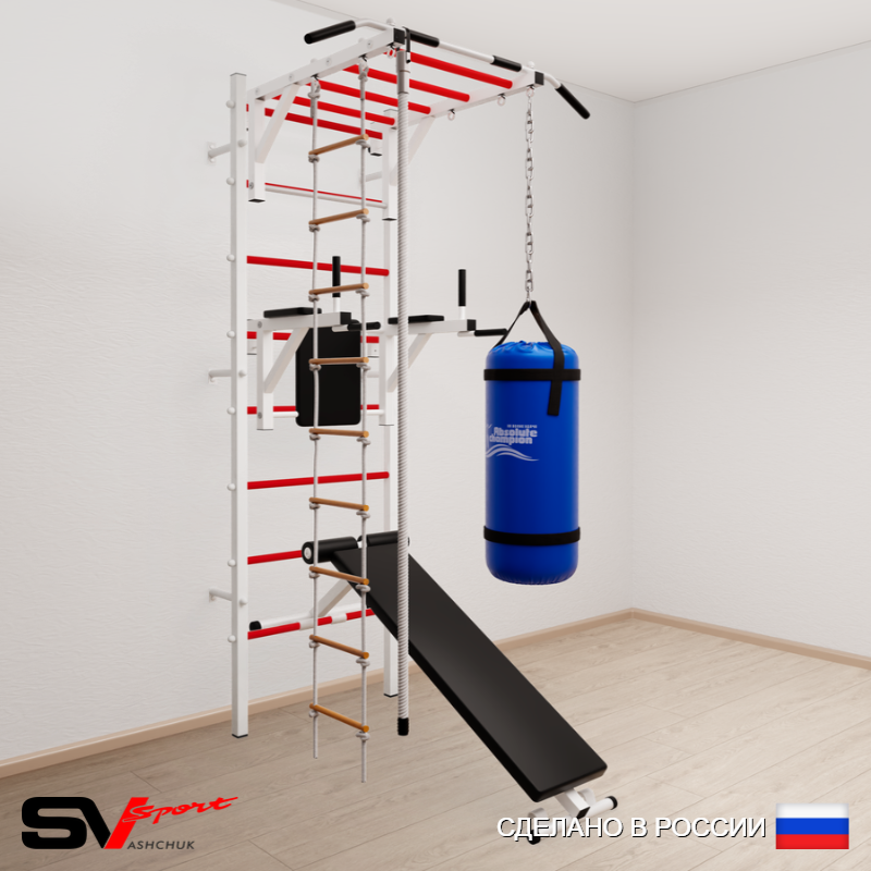 КОМПЛЕКТАЦИЯ: Шведская стенка Sv Sport усиленная (профиль вертикальных стоек 60 х 40 х 2 мм), Турник Sv Sport рукоход к ШС, Брусья Sv Sport к ШС, Скамья для пресса и жима Sv Sport к ШС, Kанат, Лестница веревочная, Цепь удлинитель 90см, Мешок боксерский 15кг.