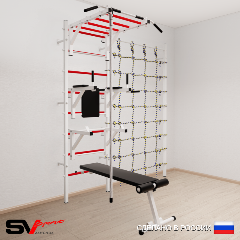 КОМПЛЕКТАЦИЯ: Шведская стенка Sv Sport усиленная (профиль вертикальных стоек 60 х 40 х 2 мм), Турник Sv Sport рукоход к ШС, Брусья Sv Sport к ШС, Стойка под штангу Sv Sport к ШС, Скамья для пресса и жима Sv Sport к ШС, Kанат, Канатный лаз.