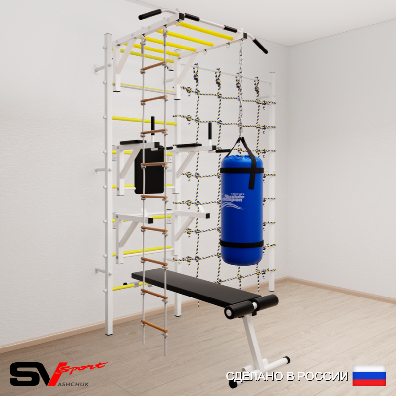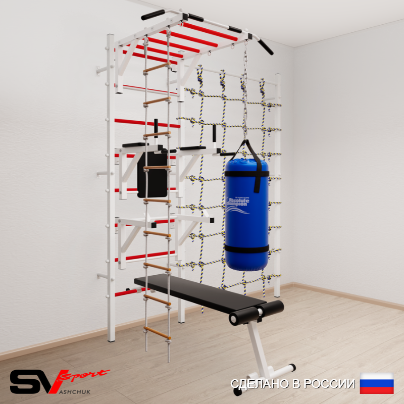 КОМПЛЕКТАЦИЯ: Шведская стенка Sv Sport усиленная (профиль вертикальных стоек 60 х 40 х 2 мм), Турник Sv Sport рукоход к ШС, Брусья Sv Sport к ШС, Стойка под штангу Sv Sport к ШС, Скамья для пресса и жима Sv Sport к ШС, Лестница веревочная, Цепь удлинитель 90см, Мешок боксерский 15кг, Канатный лаз.