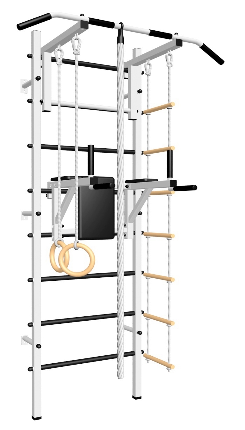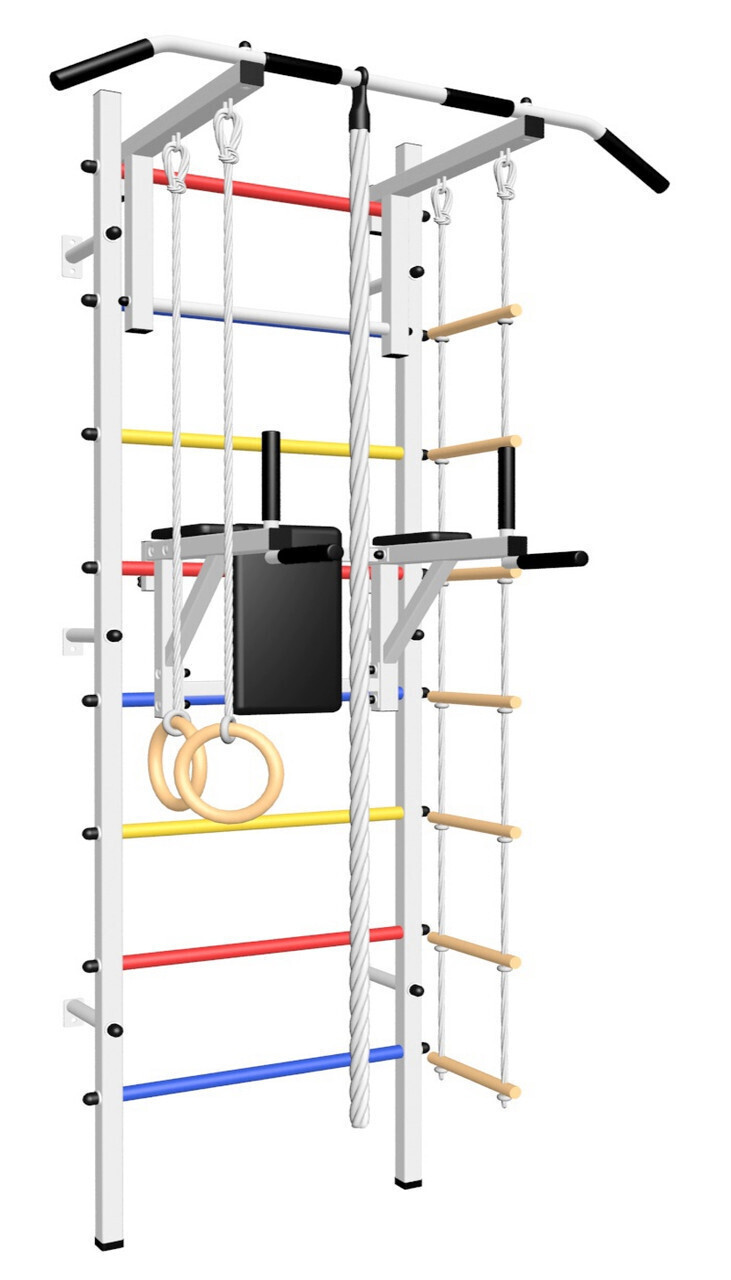 КОМПЛЕКТАЦИЯ: Шведская стенка Sv Sport (профиль вертикальных стоек 40 х 40 х 2 мм), Турник Sv Sport стандарт к ШС, Брусья Sv Sport к ШС, Kанат, Kольца деревянные, Лестница веревочная.