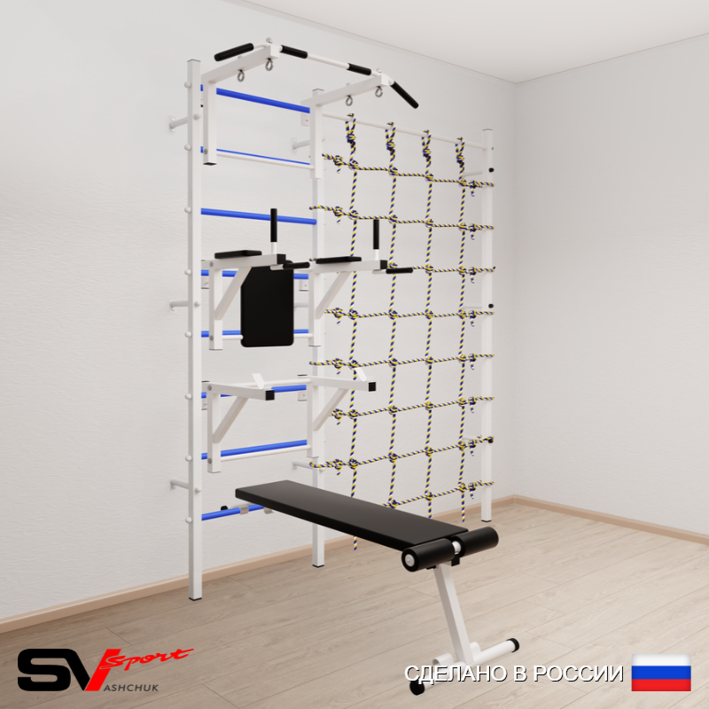 КОМПЛЕКТАЦИЯ: Шведская стенка Sv Sport (профиль вертикальных стоек 40 х 40 х 2 мм), Турник Sv Sport стандарт к ШС, Брусья Sv Sport к ШС, Стойка под штангу Sv Sport к ШС, Скамья для пресса и жима Sv Sport к ШС, Канатный лаз.