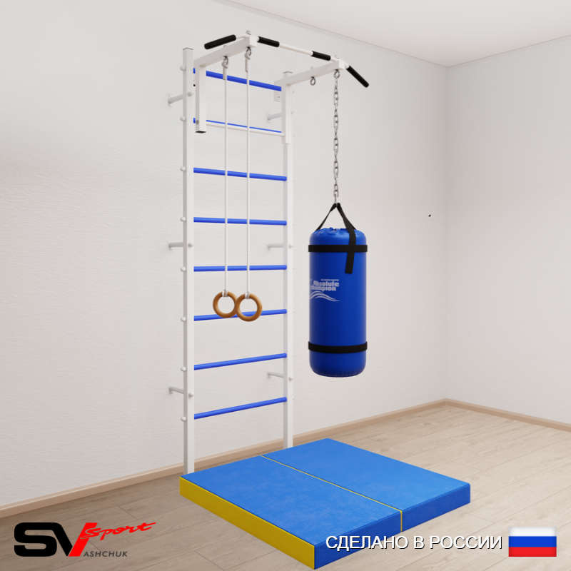 КОМПЛЕКТАЦИЯ: Шведская стенка Sv Sport (профиль вертикальных стоек 40 х 40 х 2 мм), Турник Sv Sport стандарт к ШС, Kольца деревянные, Цепь удлинитель 90см, Мешок боксерский 15кг, Спортивный мат 100 х 100 х 10 см складной.