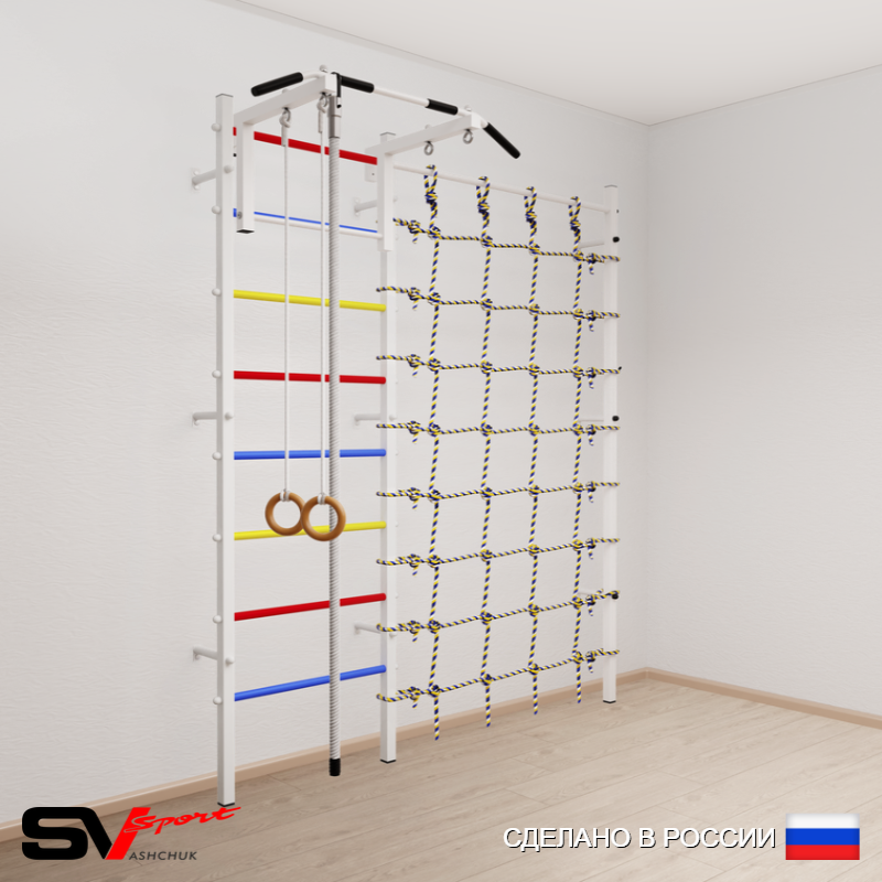 КОМПЛЕКТАЦИЯ: Шведская стенка Sv Sport (профиль вертикальных стоек 40 х 40 х 2 мм), Турник Sv Sport стандарт к ШС, Kанат, Kольца деревянные, Канатный лаз.
