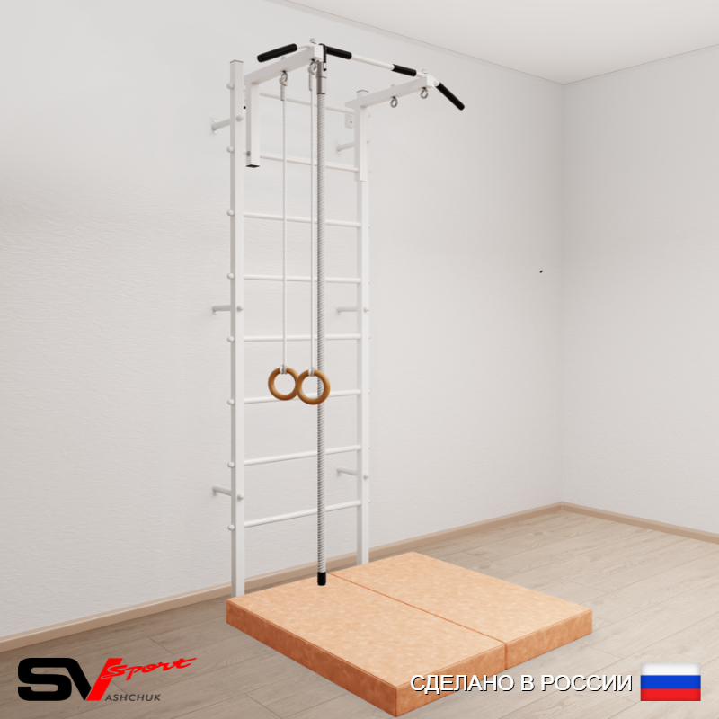 КОМПЛЕКТАЦИЯ: Шведская стенка Sv Sport (профиль вертикальных стоек 40 х 40 х 2 мм), Турник Sv Sport стандарт к ШС, Kанат, Kольца деревянные, Спортивный мат 100 х 100 х 10 см складной.