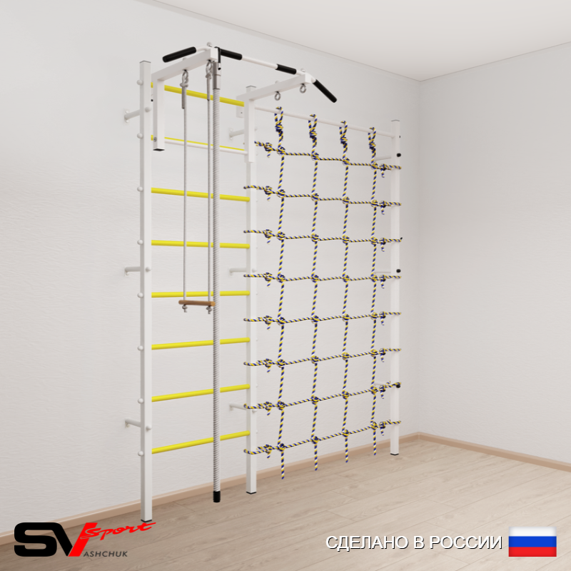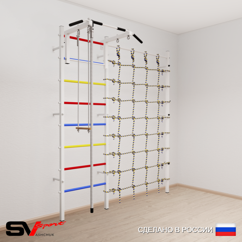 КОМПЛЕКТАЦИЯ: Шведская стенка Sv Sport (профиль вертикальных стоек 40 х 40 х 2 мм), Турник Sv Sport стандарт к ШС, Kанат, Трапеция, Канатный лаз.