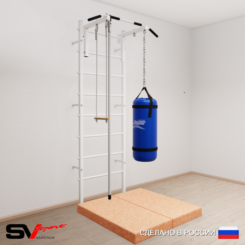 КОМПЛЕКТАЦИЯ: Шведская стенка Sv Sport (профиль вертикальных стоек 40 х 40 х 2 мм), Турник Sv Sport стандарт к ШС, Kанат, Трапеция, Цепь удлинитель 90см, Мешок боксерский 15кг, Спортивный мат 100 х 100 х 10 см складной.
