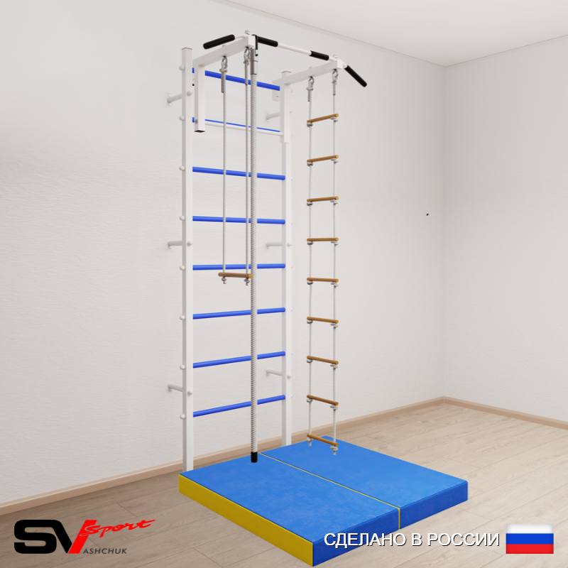 КОМПЛЕКТАЦИЯ: Шведская стенка Sv Sport (профиль вертикальных стоек 40 х 40 х 2 мм), Турник Sv Sport стандарт к ШС, Kанат, Трапеция, Лестница веревочная, Спортивный мат 100 х 100 х 10 см складной.