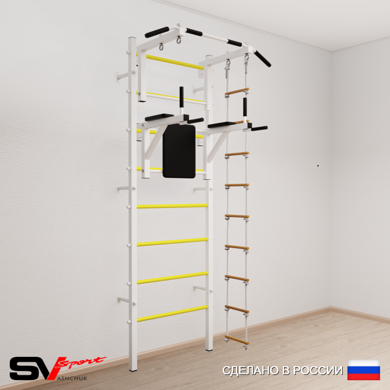 КОМПЛЕКТАЦИЯ: Шведская стенка Sv Sport (профиль вертикальных стоек 40 х 40 х 2 мм), Турник Sv Sport стандарт к ШС, Брусья Sv Sport к ШС, Лестница веревочная.