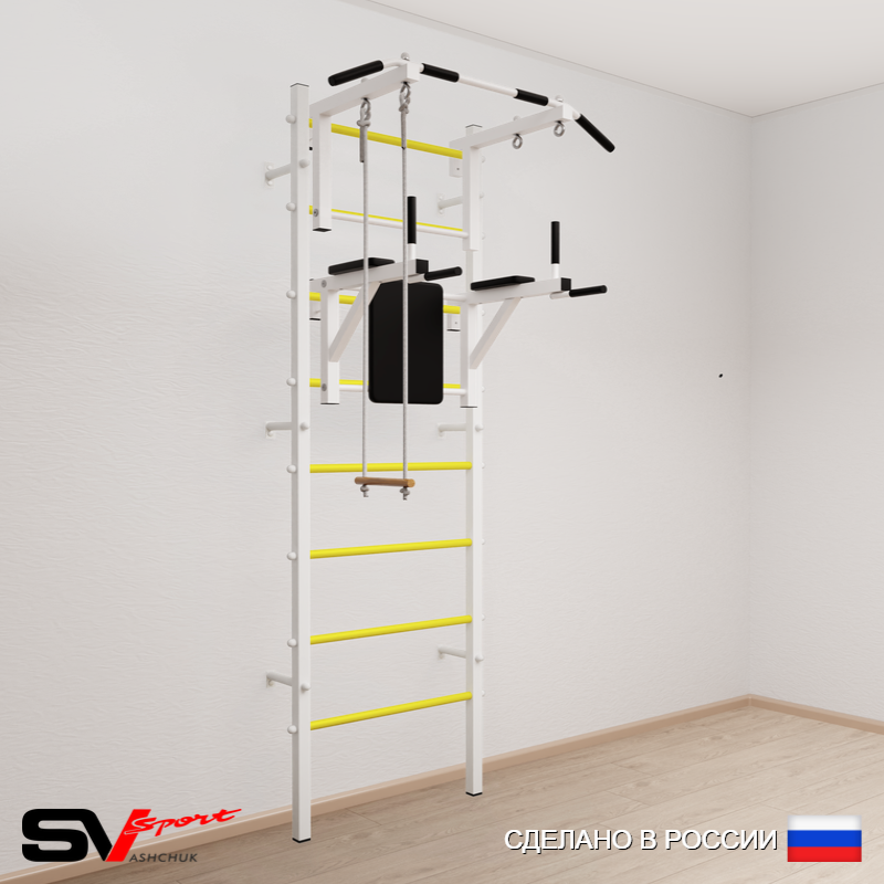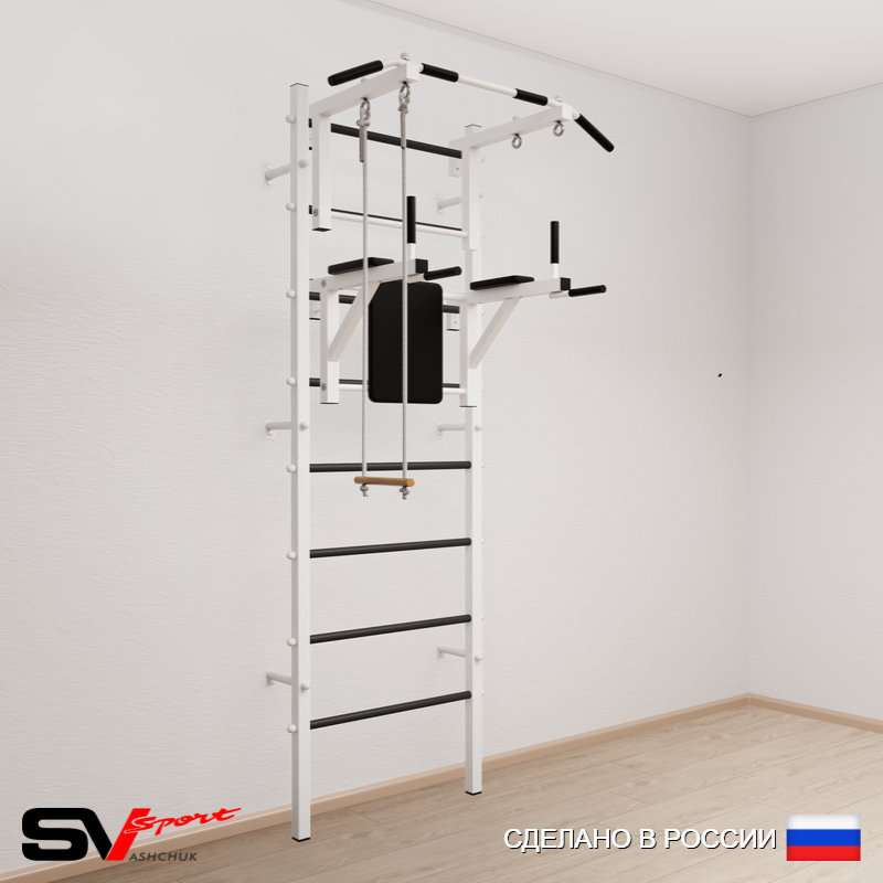 КОМПЛЕКТАЦИЯ: Шведская стенка Sv Sport (профиль вертикальных стоек 40 х 40 х 2 мм), Турник Sv Sport стандарт к ШС, Брусья Sv Sport к ШС, Трапеция.