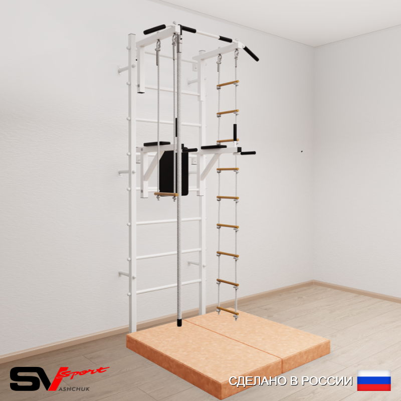 КОМПЛЕКТАЦИЯ: Шведская стенка Sv Sport (профиль вертикальных стоек 40 х 40 х 2 мм), Турник Sv Sport стандарт к ШС, Брусья Sv Sport к ШС, Kанат, Трапеция, Лестница веревочная, Спортивный мат 100 х 100 х 10 см складной.