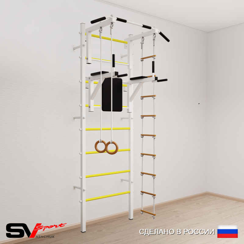 КОМПЛЕКТАЦИЯ: Шведская стенка Sv Sport (профиль вертикальных стоек 40 х 40 х 2 мм), Турник Sv Sport стандарт к ШС, Брусья Sv Sport к ШС, Kольца деревянные, Лестница веревочная.