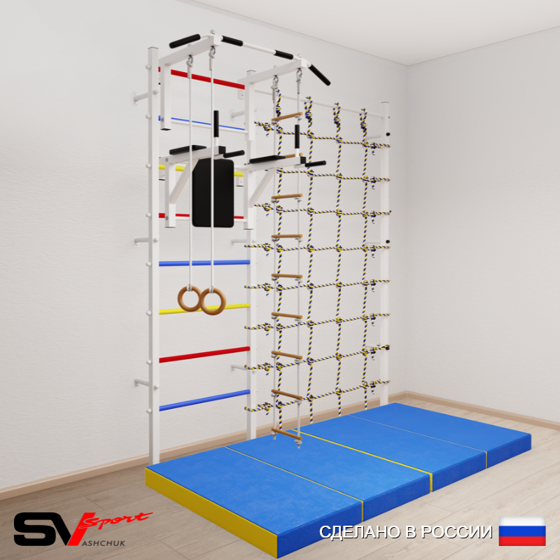 КОМПЛЕКТАЦИЯ: Шведская стенка Sv Sport (профиль вертикальных стоек 40 х 40 х 2 мм), Турник Sv Sport стандарт к ШС, Брусья Sv Sport к ШС, Kольца деревянные, Лестница веревочная, Спортивный мат 100 х 200 х 10 см складной, Канатный лаз.