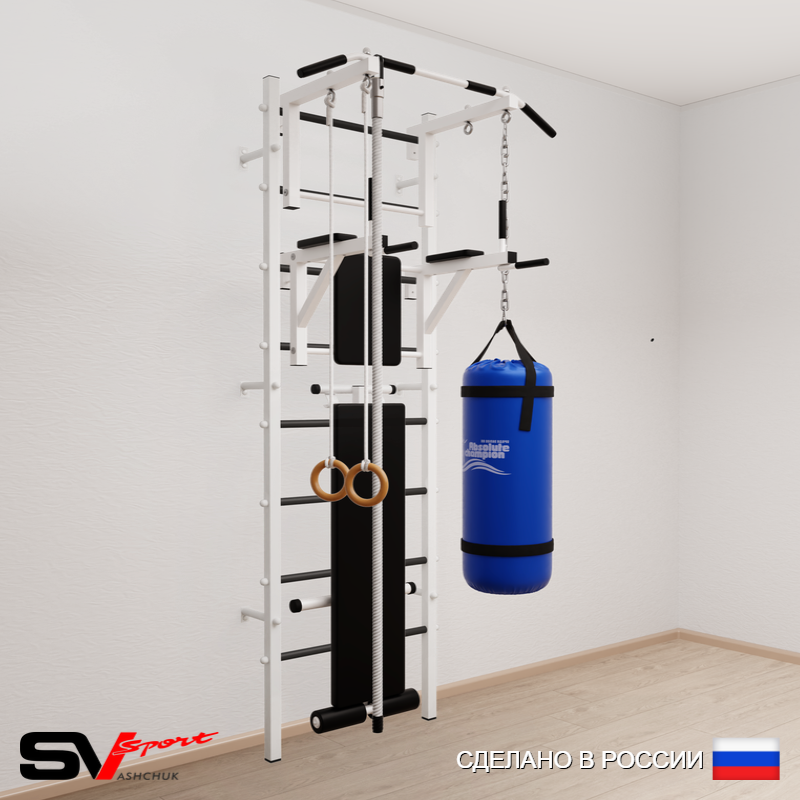 КОМПЛЕКТАЦИЯ: Шведская стенка Sv Sport (профиль вертикальных стоек 40 х 40 х 2 мм), Турник Sv Sport стандарт к ШС, Брусья Sv Sport к ШС, Скамья для пресса и жима Sv Sport к ШС, Kанат, Kольца деревянные, Цепь удлинитель 90см, Мешок боксерский 15кг.