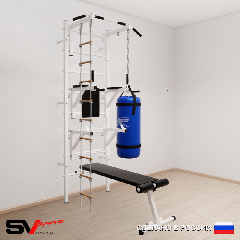 КОМПЛЕКТАЦИЯ: Шведская стенка Sv Sport (профиль вертикальных стоек 40 х 40 х 2 мм), Турник Sv Sport стандарт к ШС, Брусья Sv Sport к ШС, Стойка под штангу Sv Sport к ШС, Скамья для пресса и жима Sv Sport к ШС, Лестница веревочная, Цепь удлинитель 90см, Мешок боксерский 15кг.