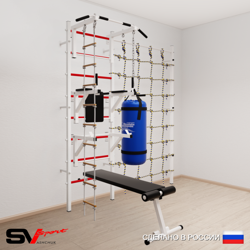 КОМПЛЕКТАЦИЯ: Шведская стенка Sv Sport (профиль вертикальных стоек 40 х 40 х 2 мм), Турник Sv Sport стандарт к ШС, Брусья Sv Sport к ШС, Стойка под штангу Sv Sport к ШС, Скамья для пресса и жима Sv Sport к ШС, Лестница веревочная, Цепь удлинитель 90см, Мешок боксерский 30кг, Канатный лаз.