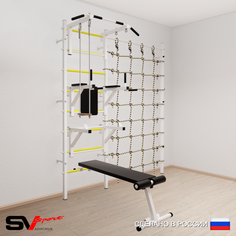 КОМПЛЕКТАЦИЯ: Шведская стенка Sv Sport (профиль вертикальных стоек 40 х 40 х 2 мм), Турник Sv Sport стандарт к ШС, Брусья Sv Sport к ШС, Стойка под штангу Sv Sport к ШС, Скамья для пресса и жима Sv Sport к ШС, Трапеция, Канатный лаз.