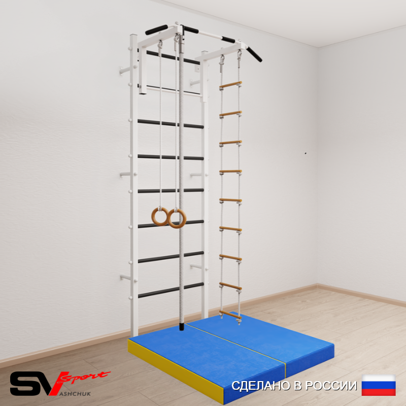 КОМПЛЕКТАЦИЯ: Шведская стенка Sv Sport усиленная (профиль вертикальных стоек 60 х 40 х 2 мм), Турник Sv Sport стандарт к ШС, Kанат, Kольца деревянные, Лестница веревочная, Спортивный мат 100 х 100 х 10 см складной.