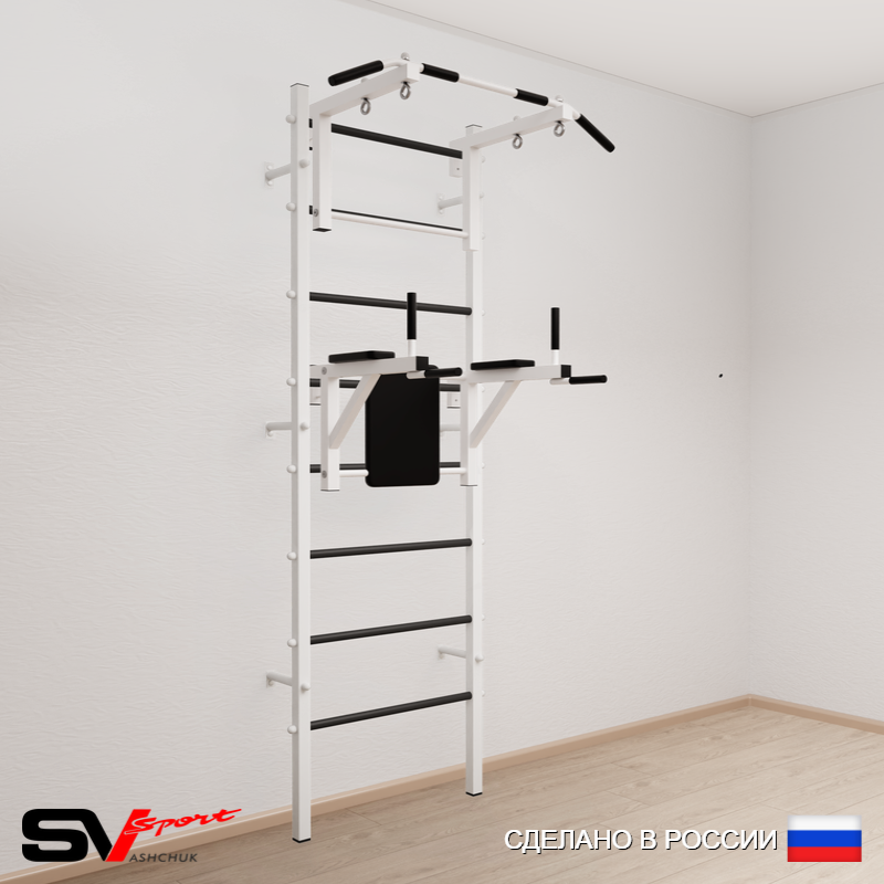 КОМПЛЕКТАЦИЯ: Шведская стенка Sv Sport усиленная (профиль вертикальных стоек 60 х 40 х 2 мм), Турник Sv Sport стандарт к ШС, Брусья Sv Sport к ШС.
