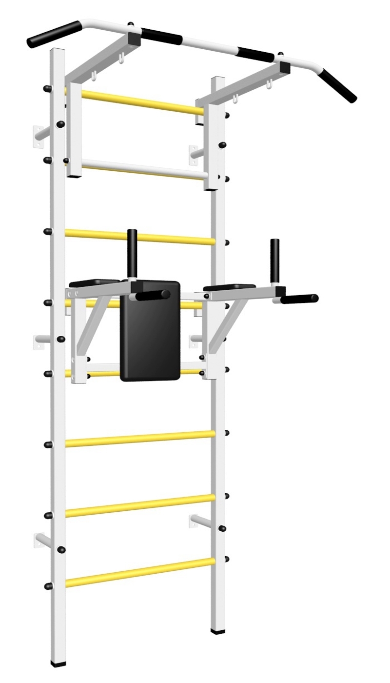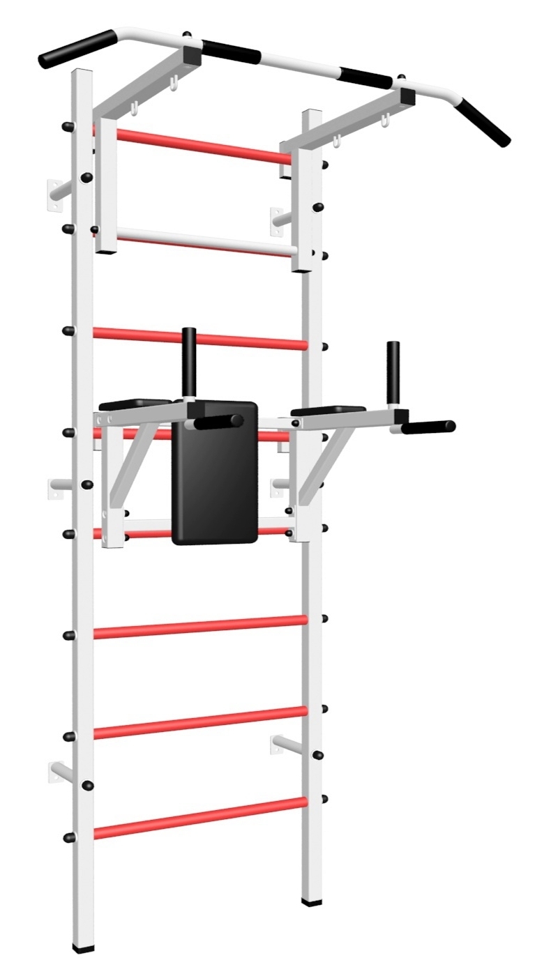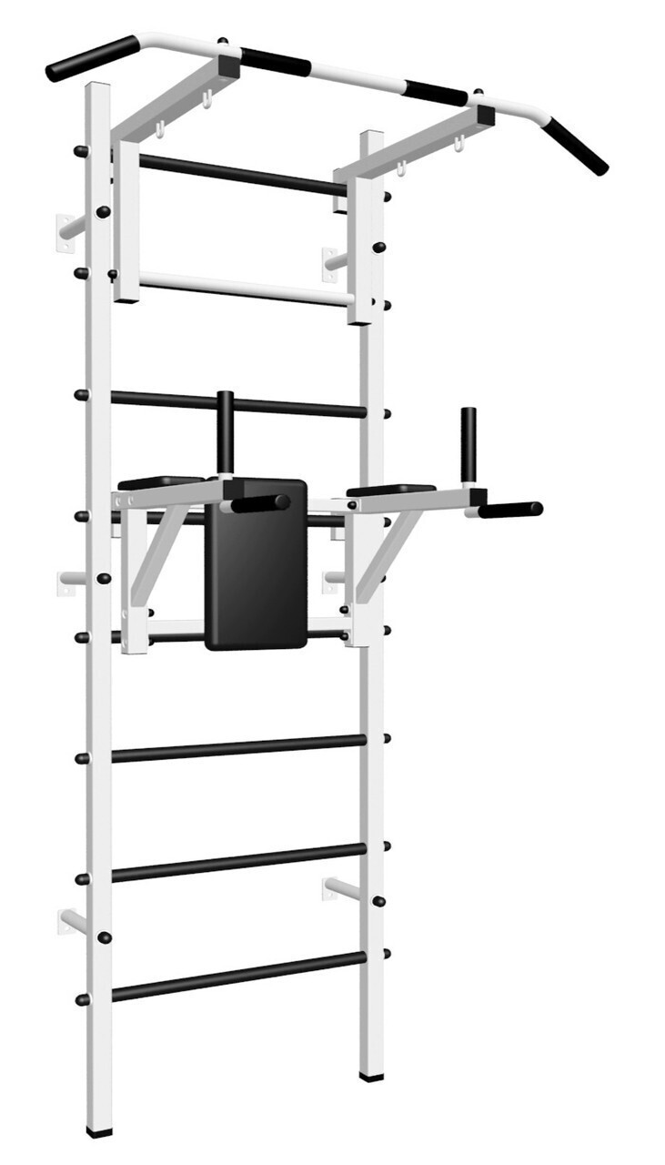 Основные характеристики: Максимально допустимая нагрузка 200 кг; Вылет брусьев от шведской стенки 68 см; Ширина креплений брусьев 54 см; Полимерная покраска; Резиновые ручки длина 16 см; Цвет покраски: белый; Гарантия 24 месяца.