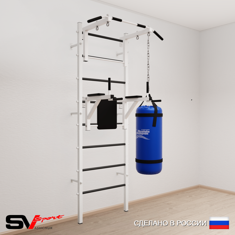 КОМПЛЕКТАЦИЯ: Шведская стенка Sv Sport усиленная (профиль вертикальных стоек 60 х 40 х 2 мм), Турник Sv Sport стандарт к ШС, Брусья Sv Sport к ШС, Цепь удлинитель 90см, Мешок боксерский 22кг.