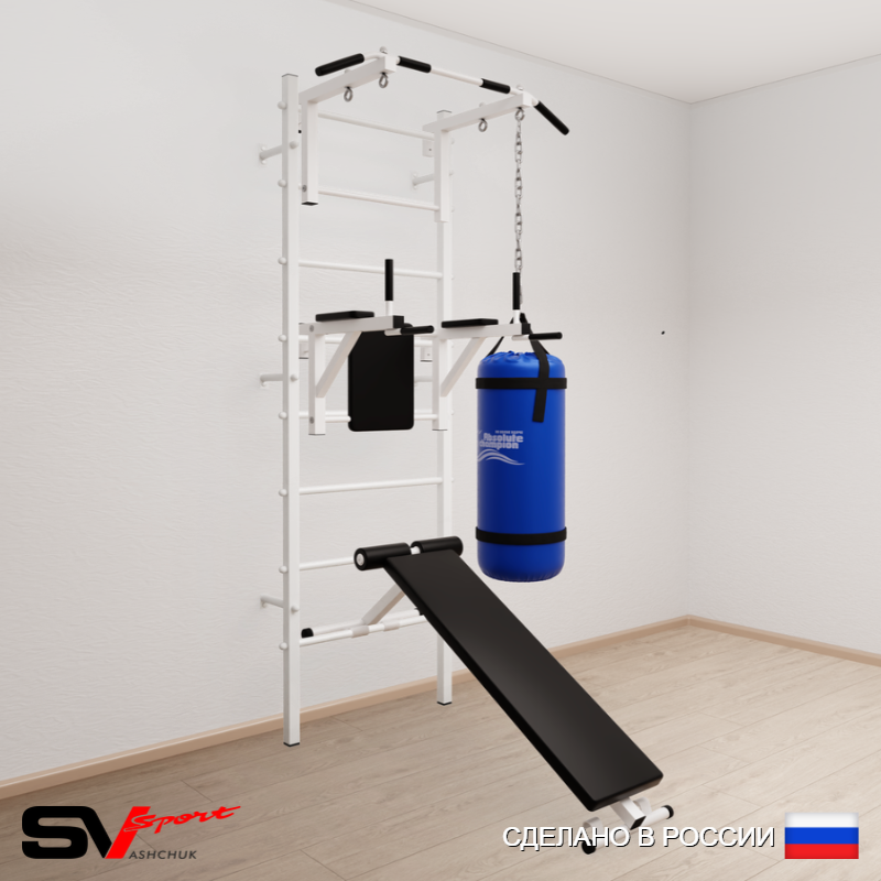 КОМПЛЕКТАЦИЯ: Шведская стенка Sv Sport усиленная (профиль вертикальных стоек 60 х 40 х 2 мм), Турник Sv Sport стандарт к ШС, Брусья Sv Sport к ШС, Скамья для пресса и жима Sv Sport к ШС, Цепь удлинитель 90см, Мешок боксерский 30кг.