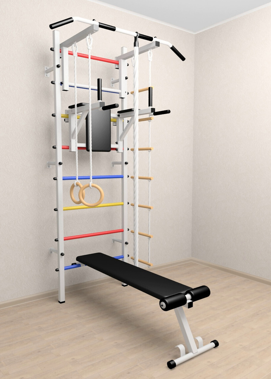 КОМПЛЕКТАЦИЯ: Шведская стенка Sv Sport усиленная (профиль вертикальных стоек 60 х 40 х 2 мм), Турник Sv Sport стандарт к ШС, Брусья Sv Sport к ШС, Скамья для пресса и жима Sv Sport к ШС, Kанат, Kольца деревянные, Лестница веревочная.