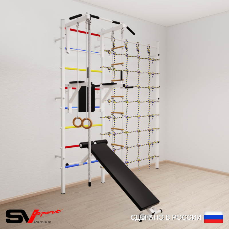 КОМПЛЕКТАЦИЯ: Шведская стенка Sv Sport усиленная (профиль вертикальных стоек 60 х 40 х 2 мм), Турник Sv Sport стандарт к ШС, Брусья Sv Sport к ШС, Скамья для пресса и жима Sv Sport к ШС, Kанат, Kольца деревянные, Лестница веревочная, Канатный лаз.