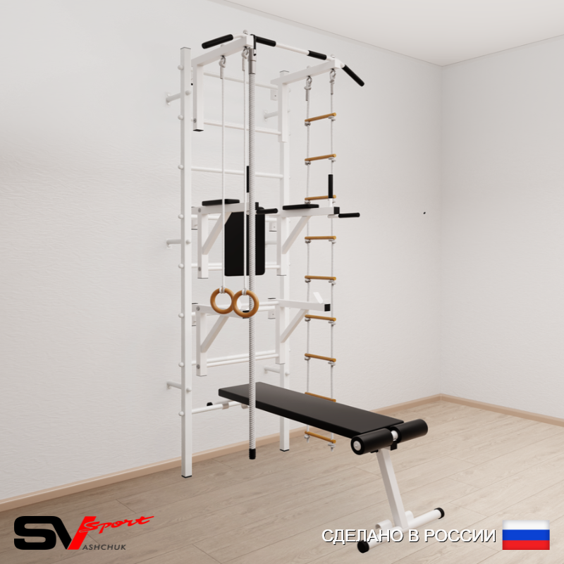 КОМПЛЕКТАЦИЯ: Шведская стенка Sv Sport усиленная (профиль вертикальных стоек 60 х 40 х 2 мм), Турник Sv Sport стандарт к ШС, Брусья Sv Sport к ШС, Стойка под штангу Sv Sport к ШС, Скамья для пресса и жима Sv Sport к ШС, Kанат, Kольца деревянные, Лестница веревочная.