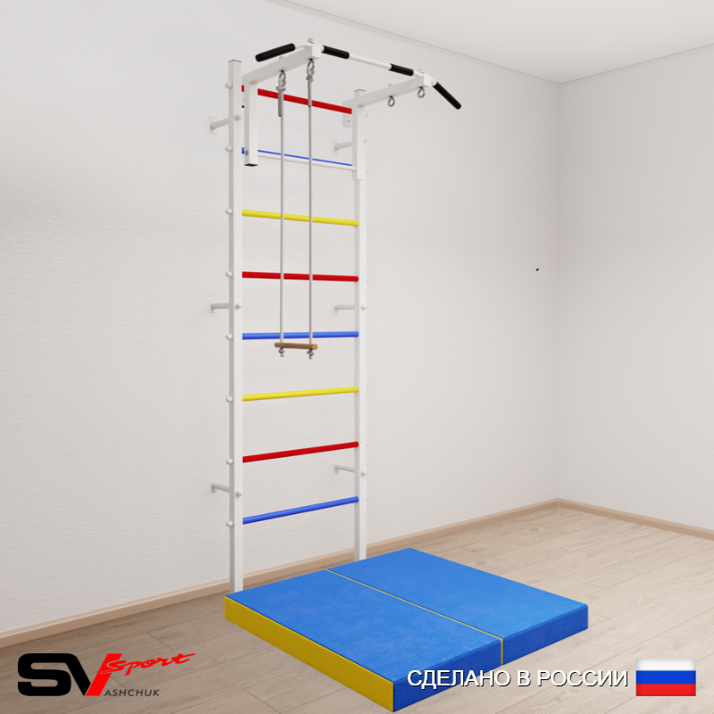 КОМПЛЕКТАЦИЯ: Шведская стенка Sv Sport усиленная (профиль вертикальных стоек 60 х 40 х 2 мм), Турник Sv Sport стандарт к ШС, Трапеция, Спортивный мат 100 х 100 х 10 см складной.