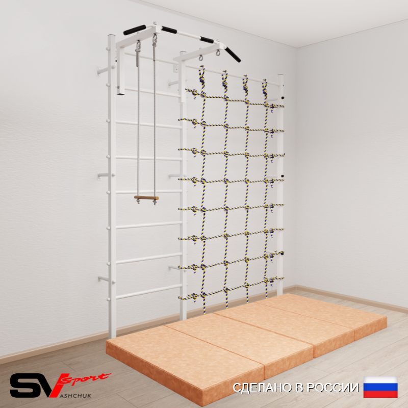 КОМПЛЕКТАЦИЯ: Шведская стенка Sv Sport усиленная (профиль вертикальных стоек 60 х 40 х 2 мм), Турник Sv Sport стандарт к ШС, Трапеция, Спортивный мат 100 х 200 х 10 см складной, Канатный лаз.
