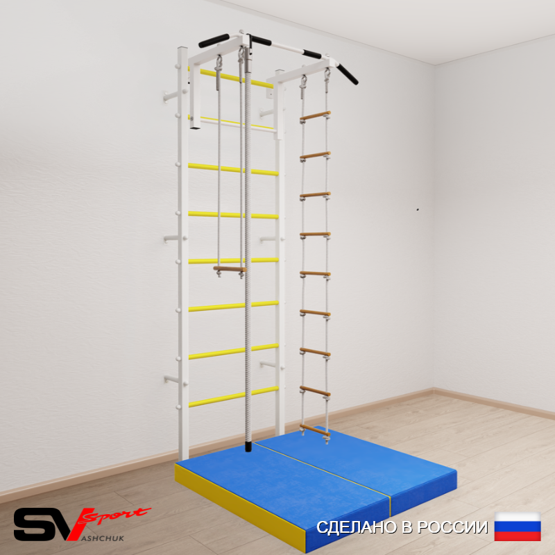 КОМПЛЕКТАЦИЯ: Шведская стенка Sv Sport усиленная (профиль вертикальных стоек 60 х 40 х 2 мм), Турник Sv Sport стандарт к ШС, Kанат, Трапеция, Лестница веревочная, Спортивный мат 100 х 100 х 10 см складной.