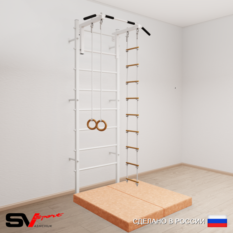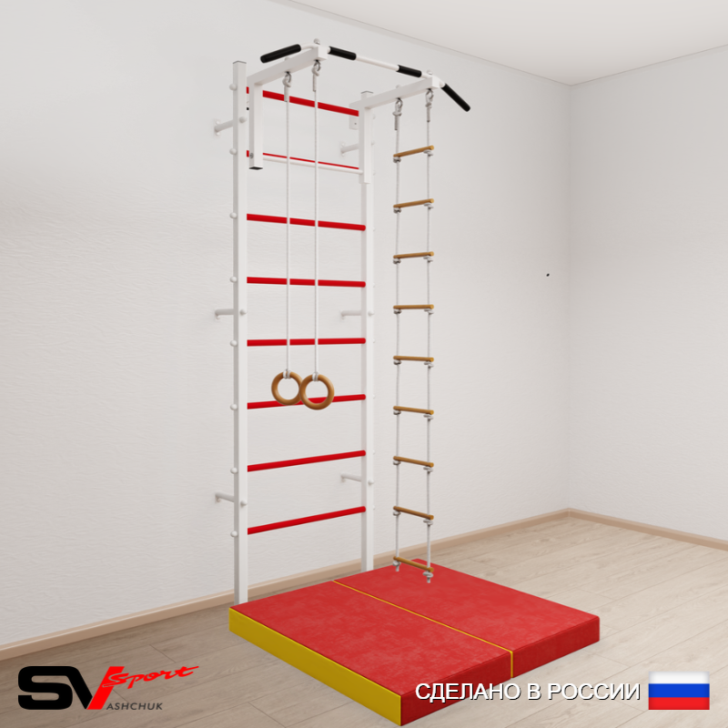 КОМПЛЕКТАЦИЯ: Шведская стенка Sv Sport усиленная (профиль вертикальных стоек 60 х 40 х 2 мм), Турник Sv Sport стандарт к ШС, Kольца деревянные, Лестница веревочная, Спортивный мат 100 х 100 х 10 см складной.