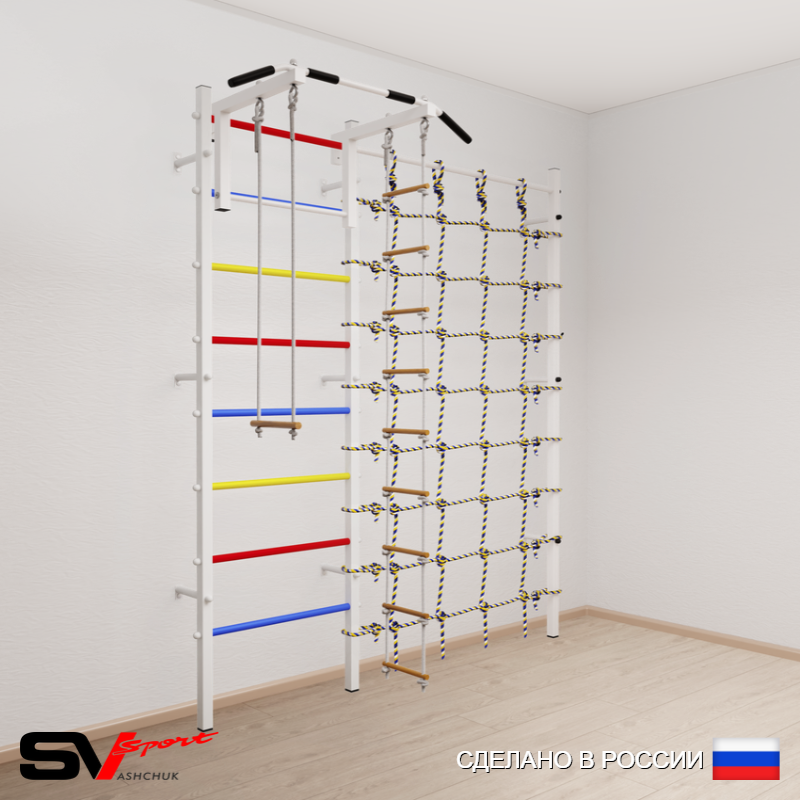 КОМПЛЕКТАЦИЯ: Шведская стенка Sv Sport усиленная (профиль вертикальных стоек 60 х 40 х 2 мм), Турник Sv Sport стандарт к ШС, Трапеция, Лестница веревочная, Канатный лаз.