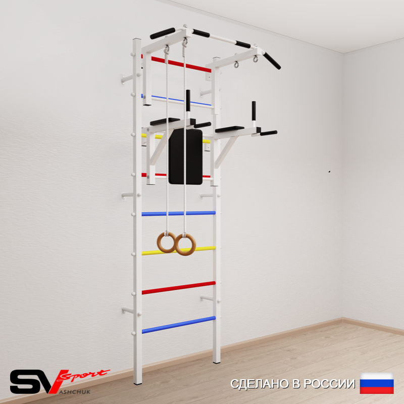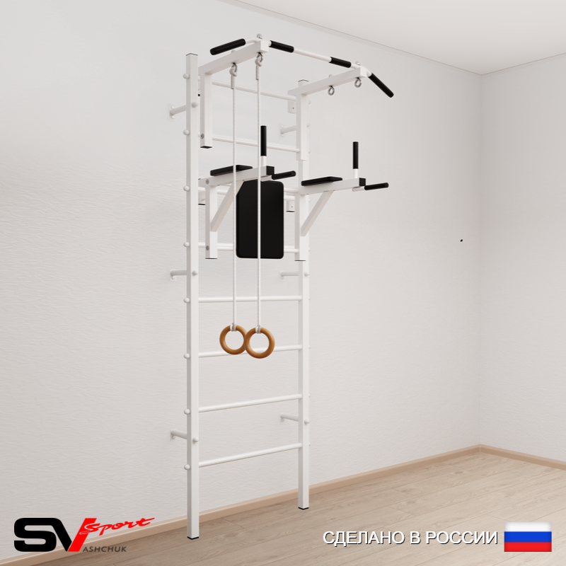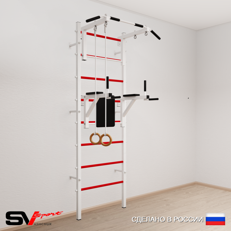 КОМПЛЕКТАЦИЯ: Шведская стенка Sv Sport усиленная (профиль вертикальных стоек 60 х 40 х 2 мм), Турник Sv Sport стандарт к ШС, Брусья Sv Sport к ШС, Kольца деревянные.
