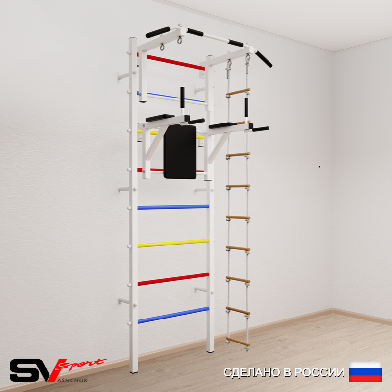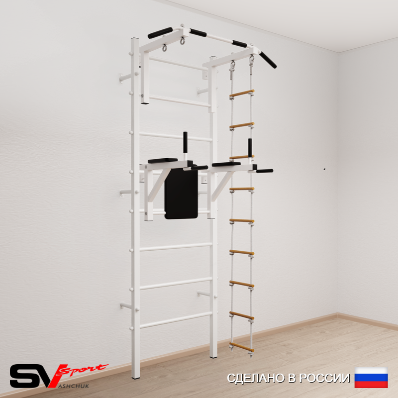 КОМПЛЕКТАЦИЯ: Шведская стенка Sv Sport усиленная (профиль вертикальных стоек 60 х 40 х 2 мм), Турник Sv Sport стандарт к ШС, Брусья Sv Sport к ШС, Лестница веревочная.