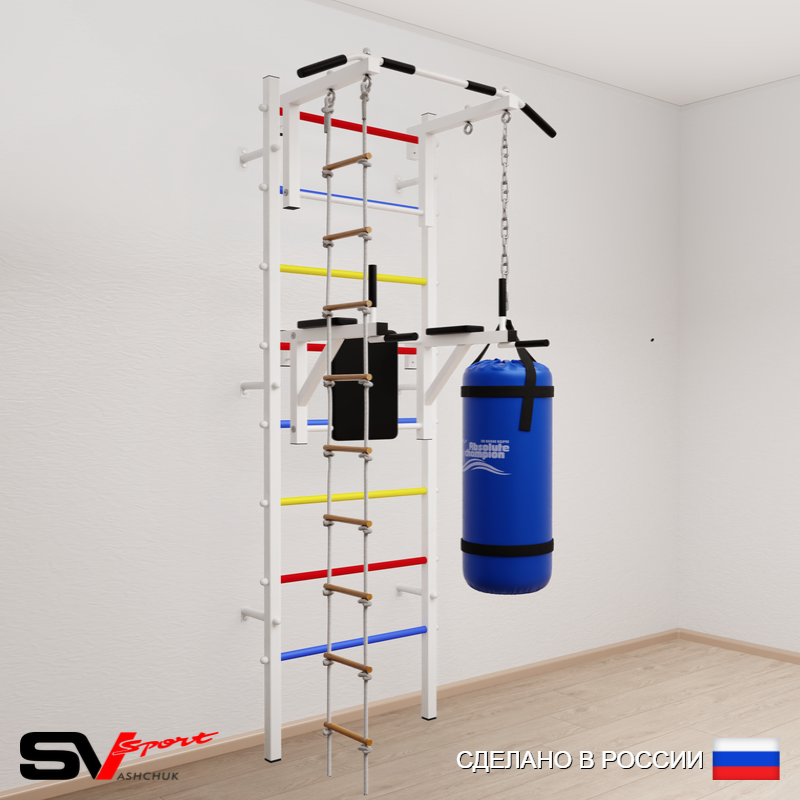КОМПЛЕКТАЦИЯ: Шведская стенка Sv Sport усиленная (профиль вертикальных стоек 60 х 40 х 2 мм), Турник Sv Sport стандарт к ШС, Брусья Sv Sport к ШС, Лестница веревочная, Цепь удлинитель 90см, Мешок боксерский 22кг.