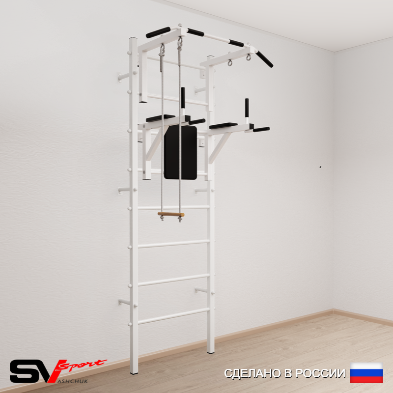 КОМПЛЕКТАЦИЯ: Шведская стенка Sv Sport усиленная (профиль вертикальных стоек 60 х 40 х 2 мм), Турник Sv Sport стандарт к ШС, Брусья Sv Sport к ШС, Трапеция.