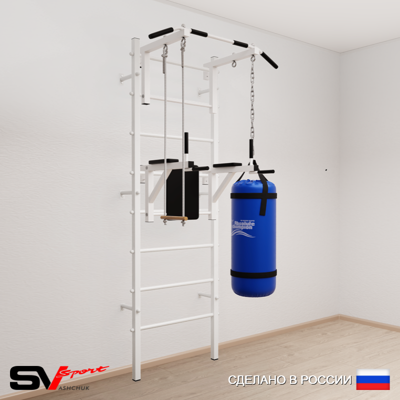 КОМПЛЕКТАЦИЯ: Шведская стенка Sv Sport усиленная (профиль вертикальных стоек 60 х 40 х 2 мм), Турник Sv Sport стандарт к ШС, Брусья Sv Sport к ШС, Трапеция, Цепь удлинитель 90см, Мешок боксерский 15кг.