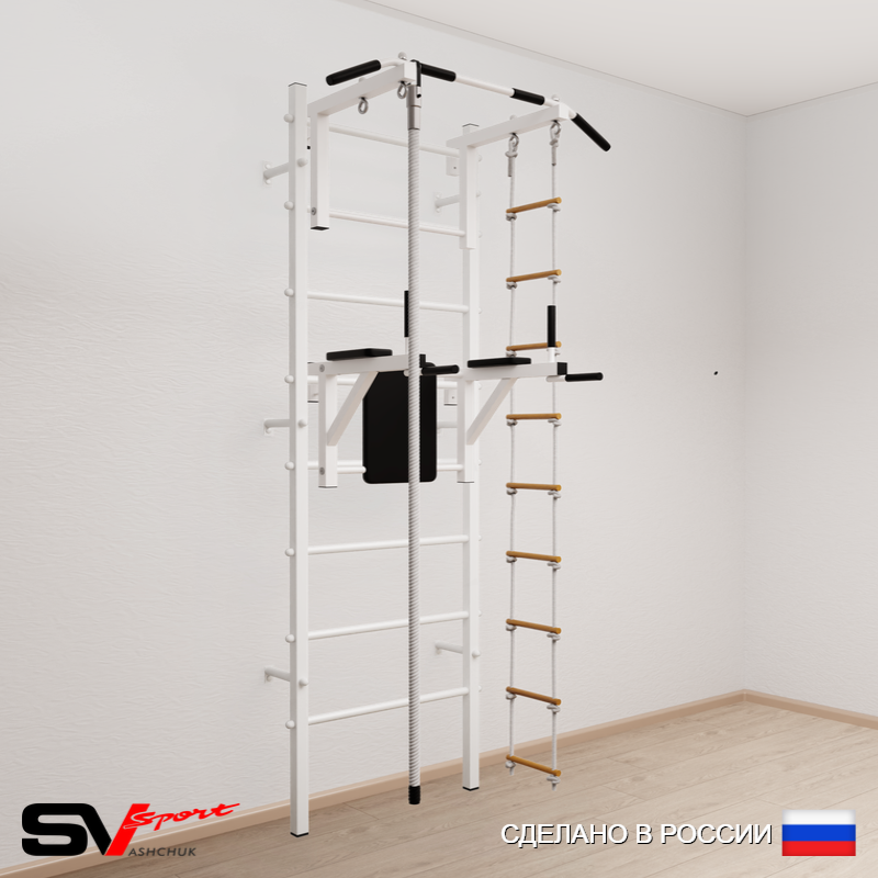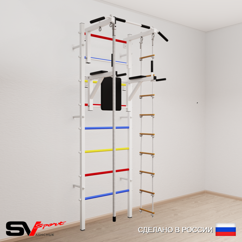 КОМПЛЕКТАЦИЯ: Шведская стенка Sv Sport усиленная (профиль вертикальных стоек 60 х 40 х 2 мм), Турник Sv Sport стандарт к ШС, Брусья Sv Sport к ШС, Kанат, Лестница веревочная.