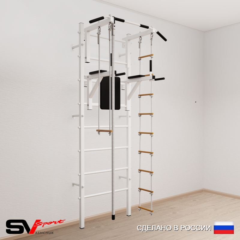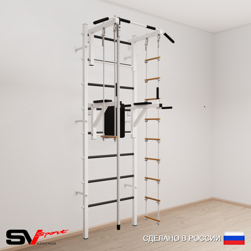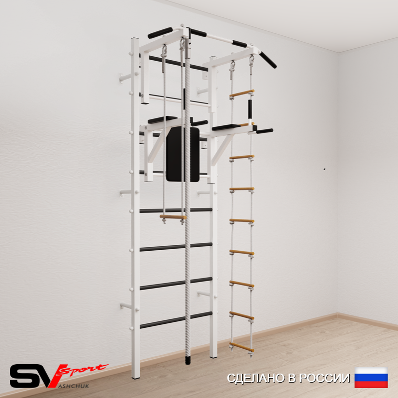 КОМПЛЕКТАЦИЯ: Шведская стенка Sv Sport усиленная (профиль вертикальных стоек 60 х 40 х 2 мм), Турник Sv Sport стандарт к ШС, Брусья Sv Sport к ШС, Kанат, Трапеция, Лестница веревочная.