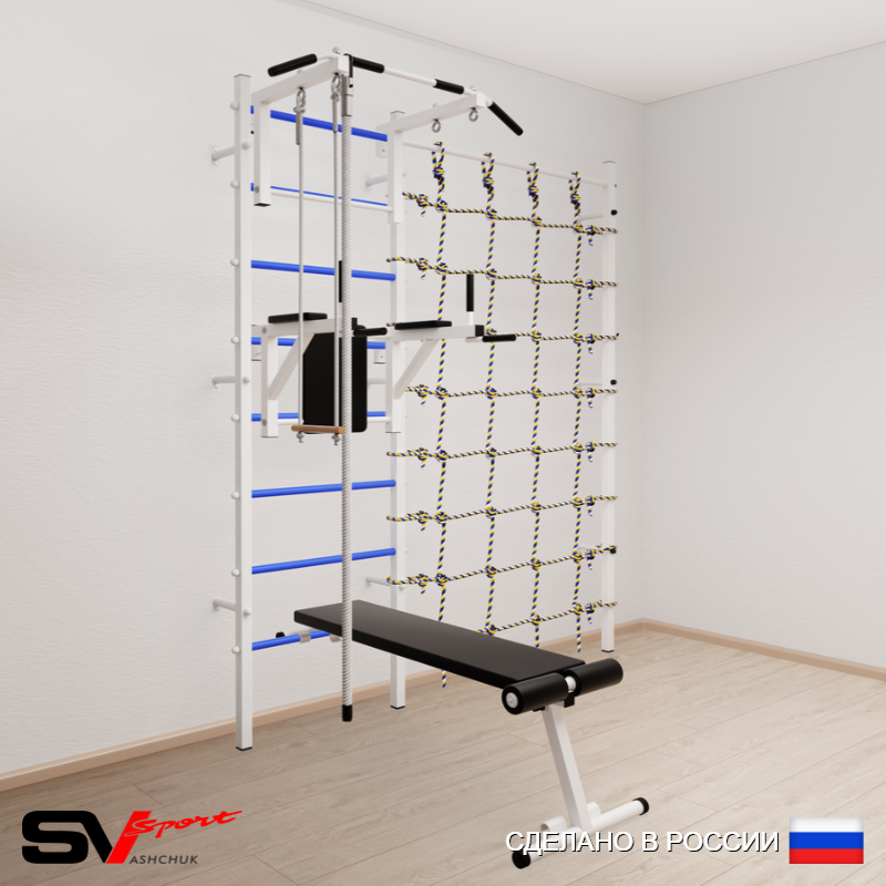 КОМПЛЕКТАЦИЯ: Шведская стенка Sv Sport усиленная (профиль вертикальных стоек 60 х 40 х 2 мм), Турник Sv Sport стандарт к ШС, Брусья Sv Sport к ШС, Скамья для пресса и жима Sv Sport к ШС, Kанат, Трапеция, Канатный лаз.