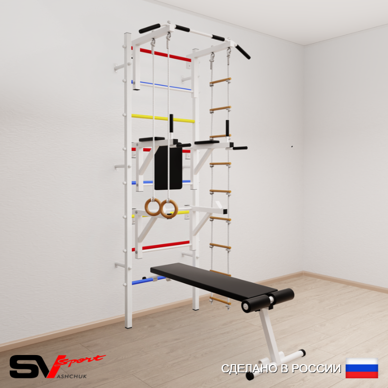 КОМПЛЕКТАЦИЯ: Шведская стенка Sv Sport усиленная (профиль вертикальных стоек 60 х 40 х 2 мм), Турник Sv Sport стандарт к ШС, Брусья Sv Sport к ШС, Стойка под штангу Sv Sport к ШС, Скамья для пресса и жима Sv Sport к ШС, Kольца деревянные, Лестница веревочная.