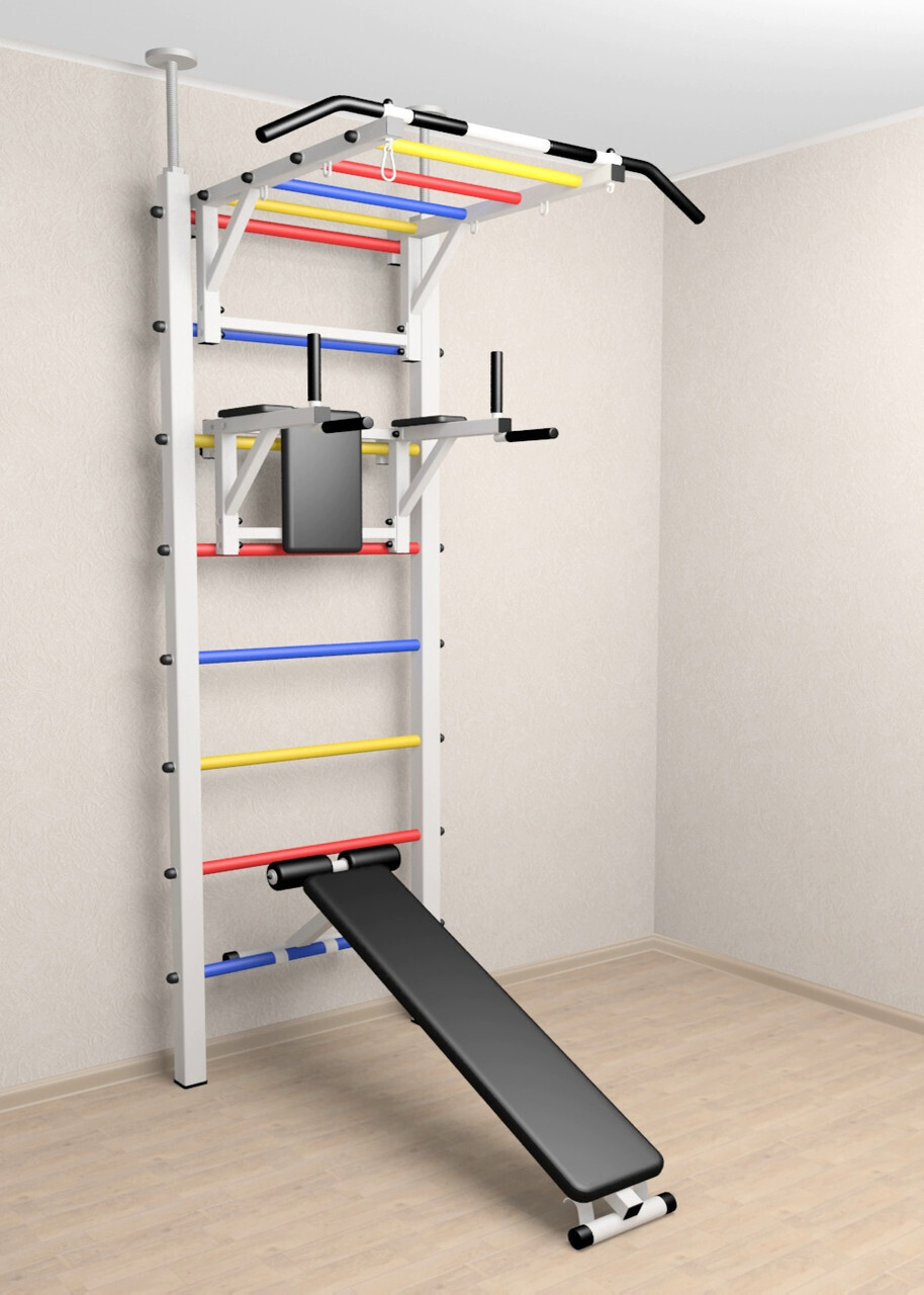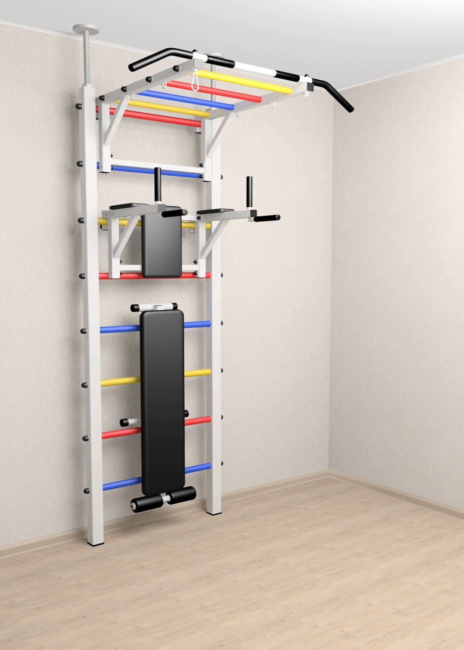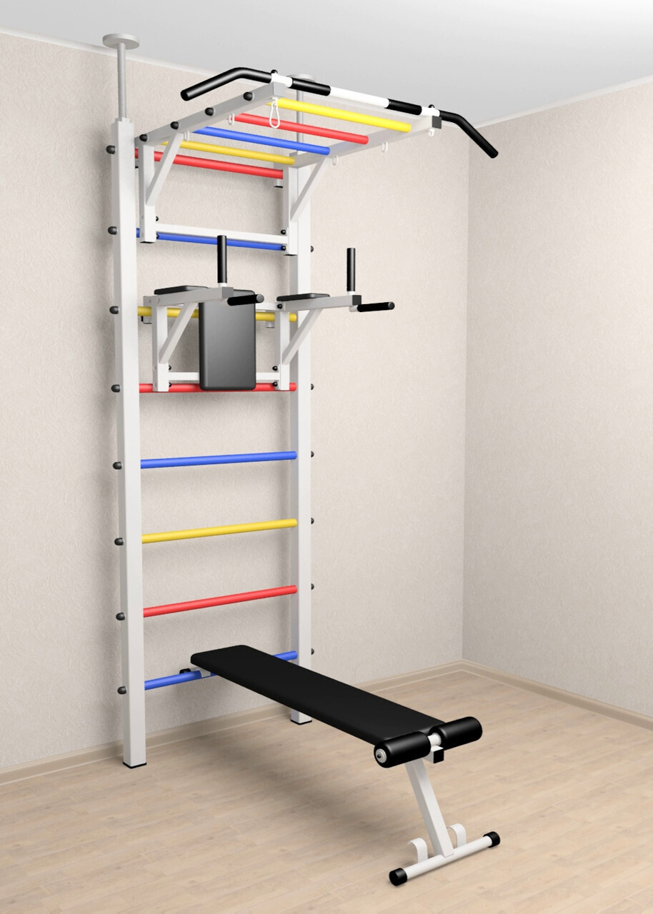 КОМПЛЕКТАЦИЯ: Шведская стенка Sv Sport враспор, Турник Sv Sport рукоход к ШС, Брусья Sv Sport к ШС, Скамья для пресса и жима Sv Sport к ШС.