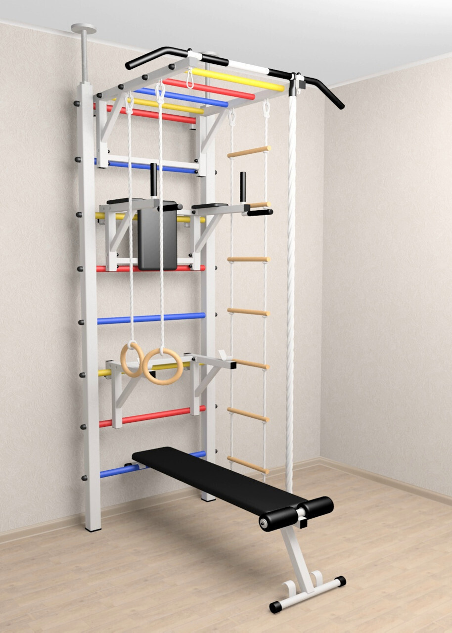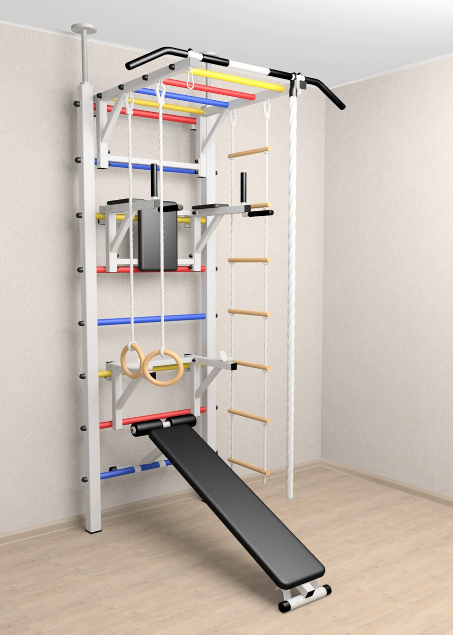 КОМПЛЕКТАЦИЯ: Шведская стенка Sv Sport враспор, Турник Sv Sport рукоход к ШС, Брусья Sv Sport к ШС, Стойка под штангу Sv Sport к ШС, Скамья для пресса и жима Sv Sport к ШС, Kанат, Kольца деревянные, Лестница веревочная.