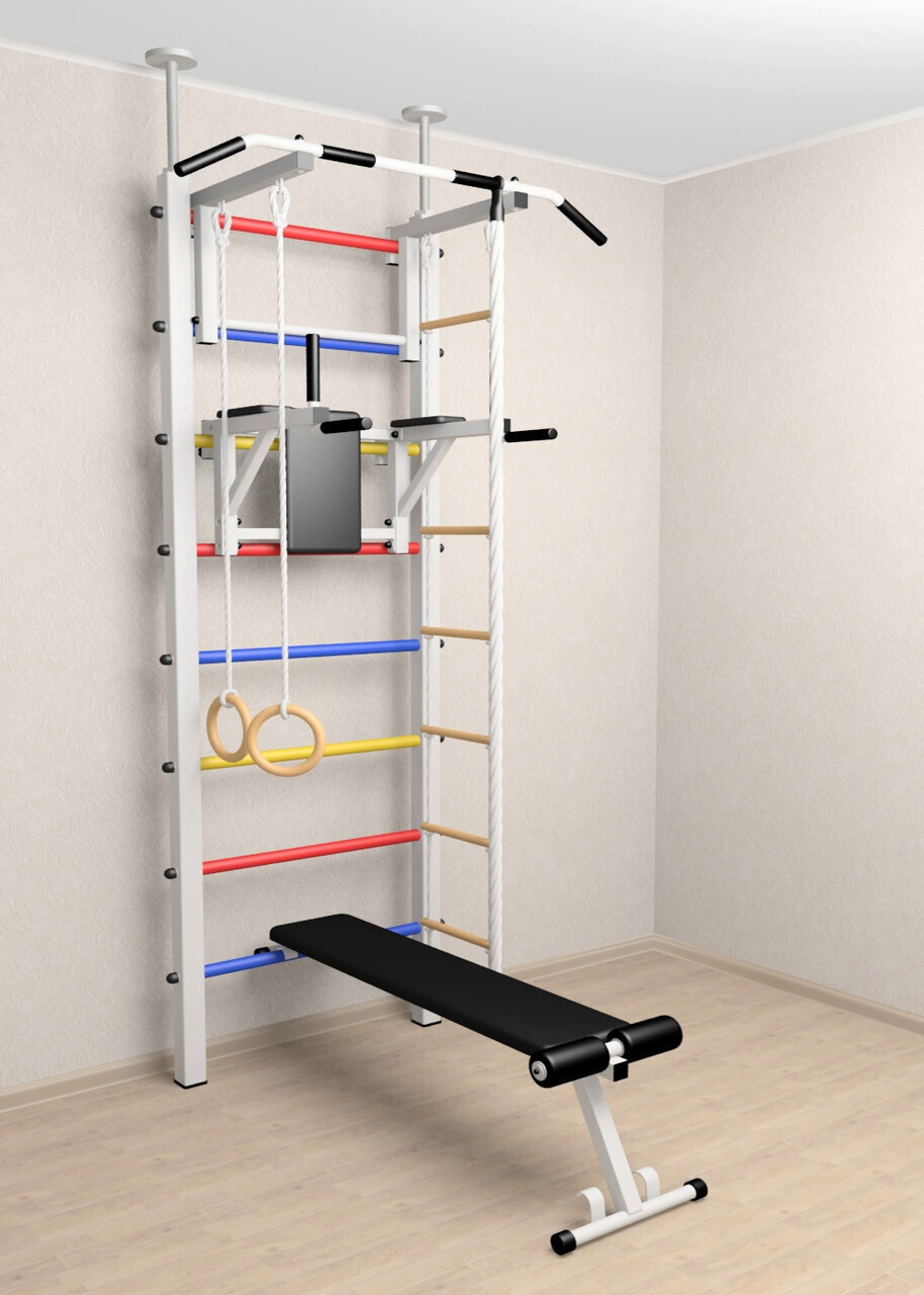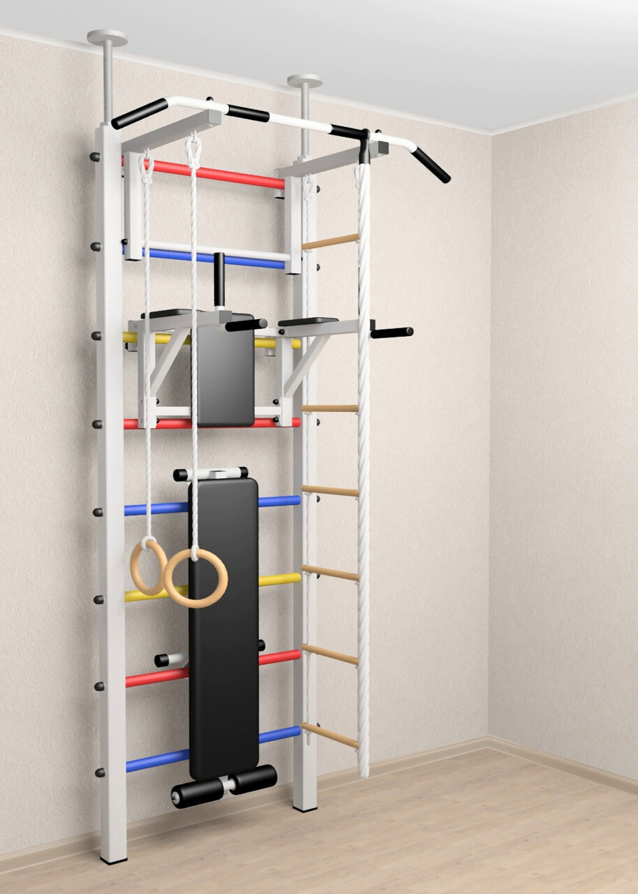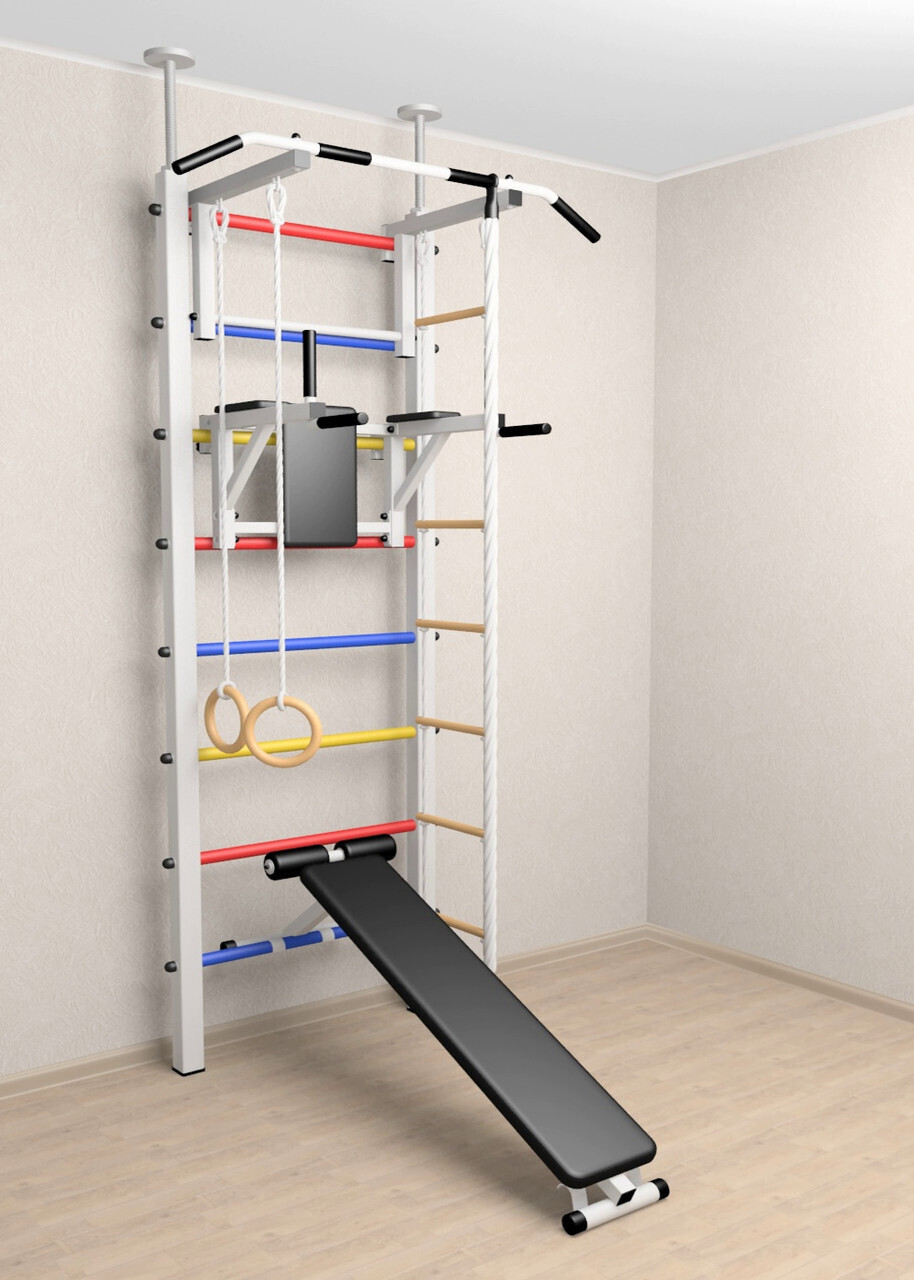 КОМПЛЕКТАЦИЯ: Шведская стенка Sv Sport враспор, Турник Sv Sport стандарт к ШС, Брусья Sv Sport к ШС, Скамья для пресса и жима Sv Sport к ШС, Kанат, Kольца деревянные, Лестница веревочная.