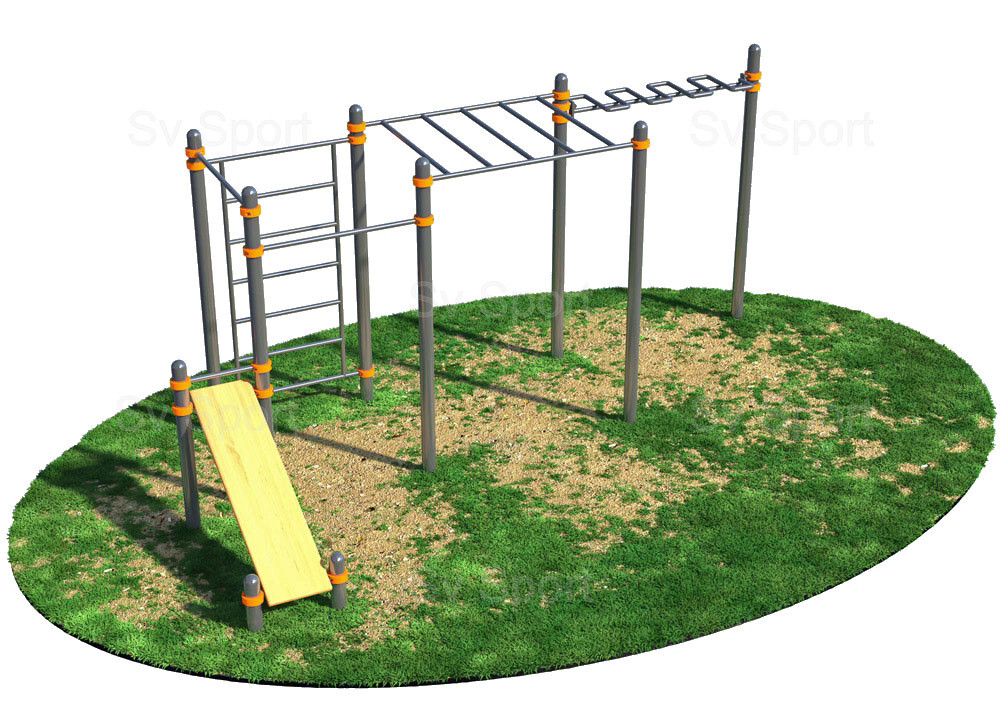 - Регулируемые по высоте перекладины, скамья для пресса, секция рукоход, рукоход змейка.