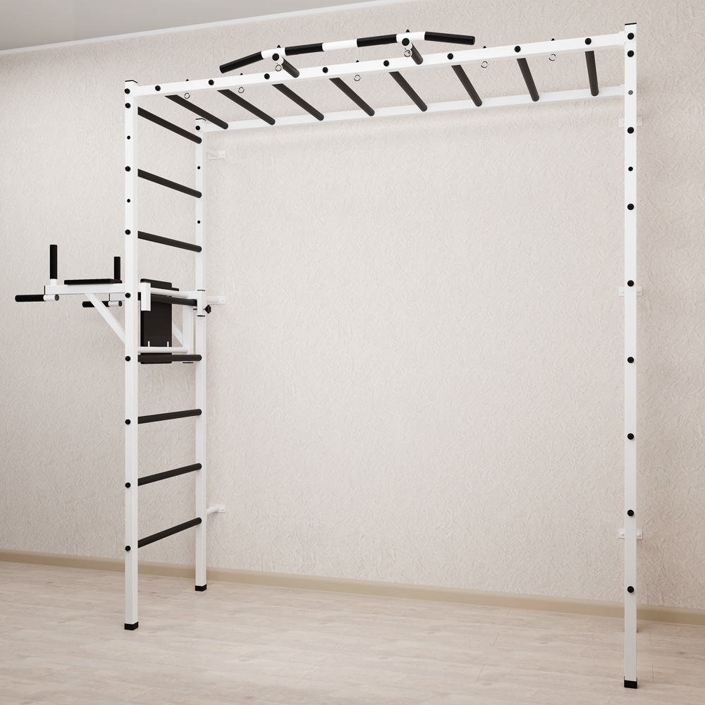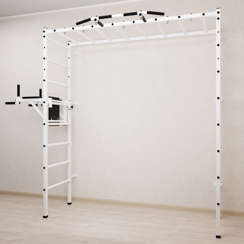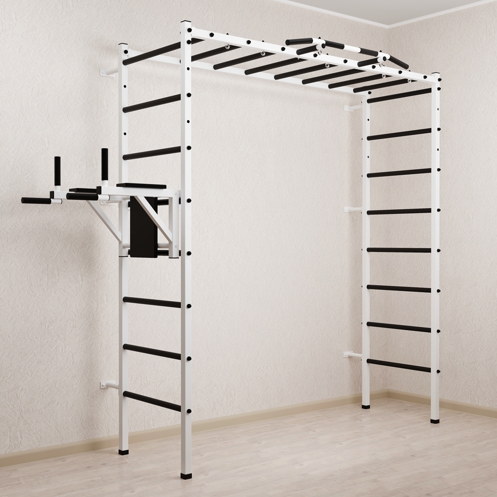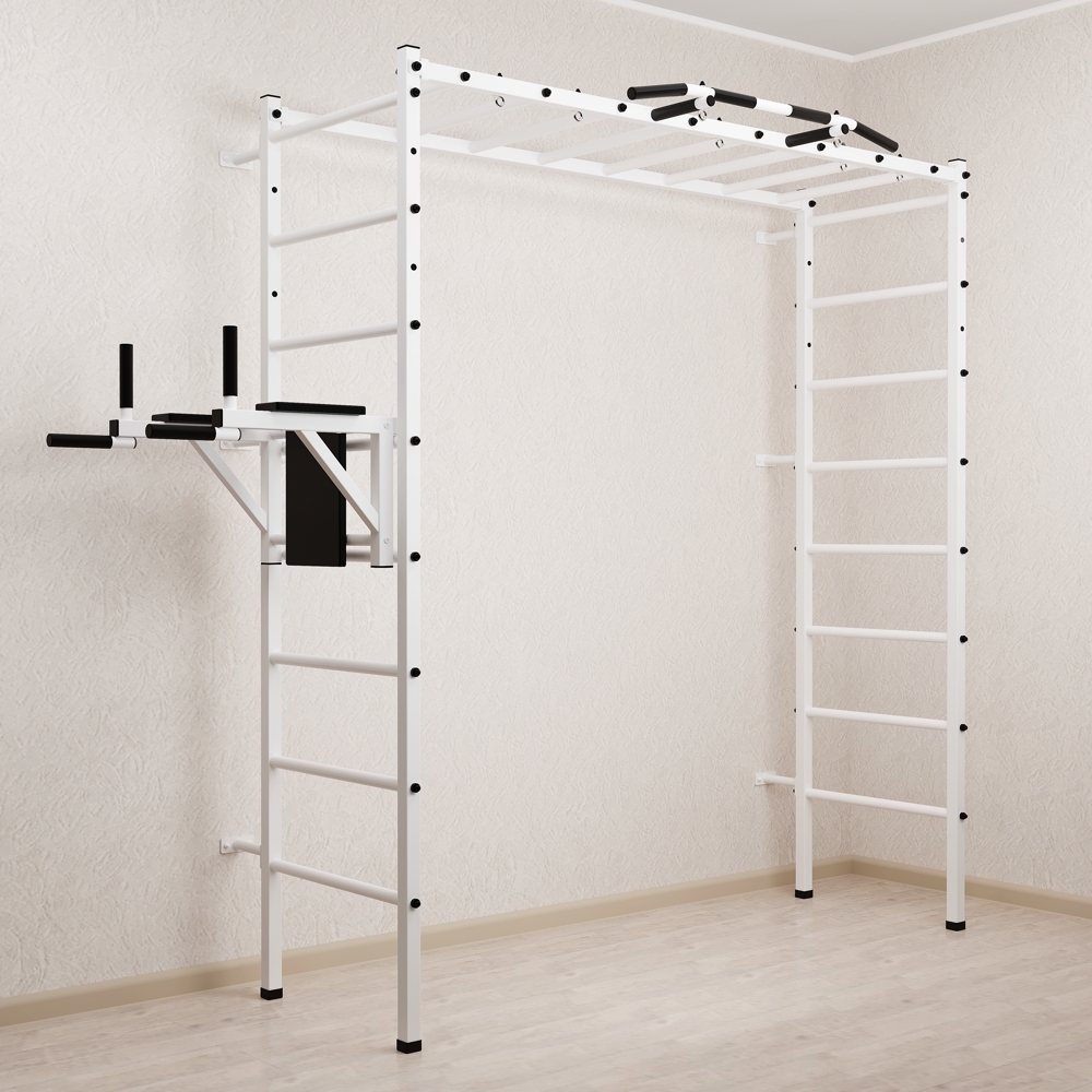 Основные характеристики: Максимально допустимая нагрузка 200 кг; Вылет брусьев от шведской стенки 68 см; Ширина креплений брусьев 54 см; Полимерная покраска; Резиновые ручки длина 16 см; Цвет покраски: белый; Гарантия 24 месяца.