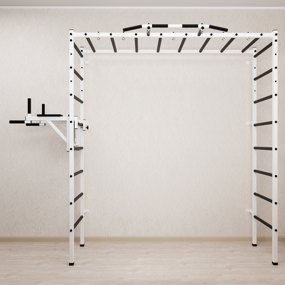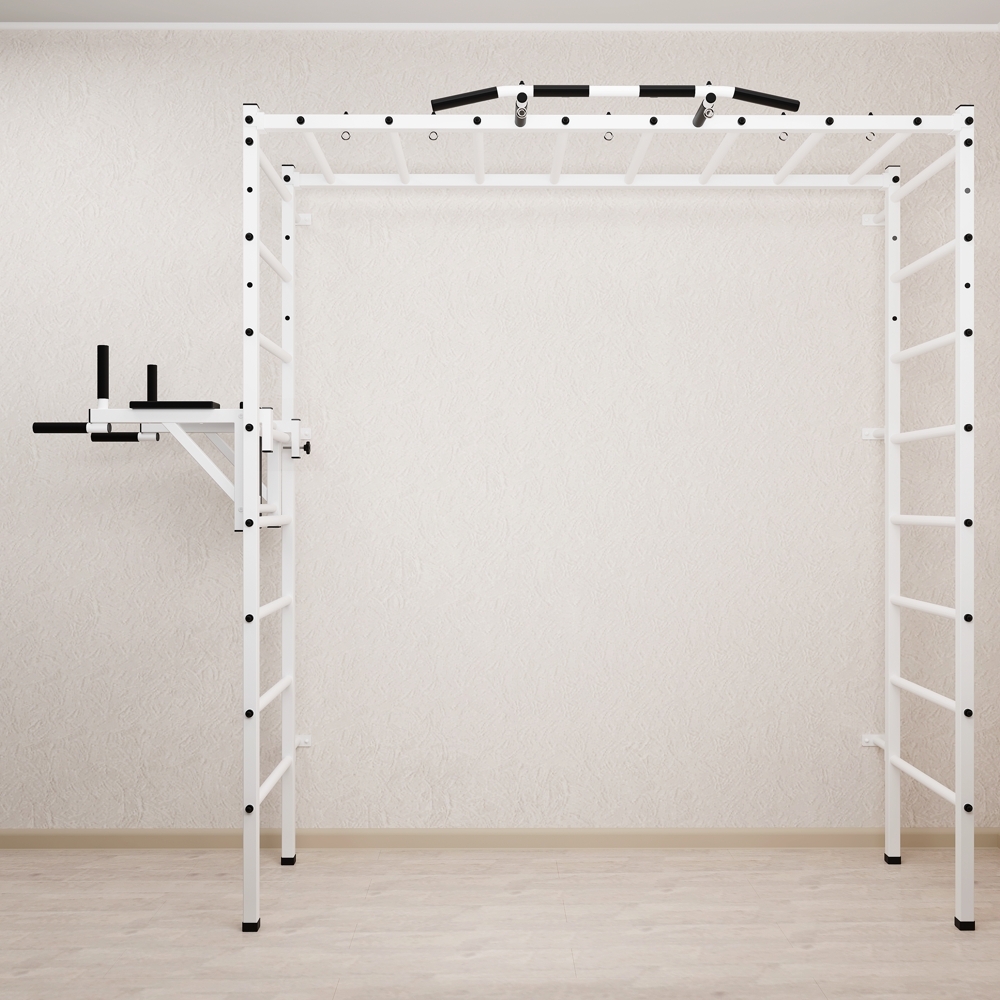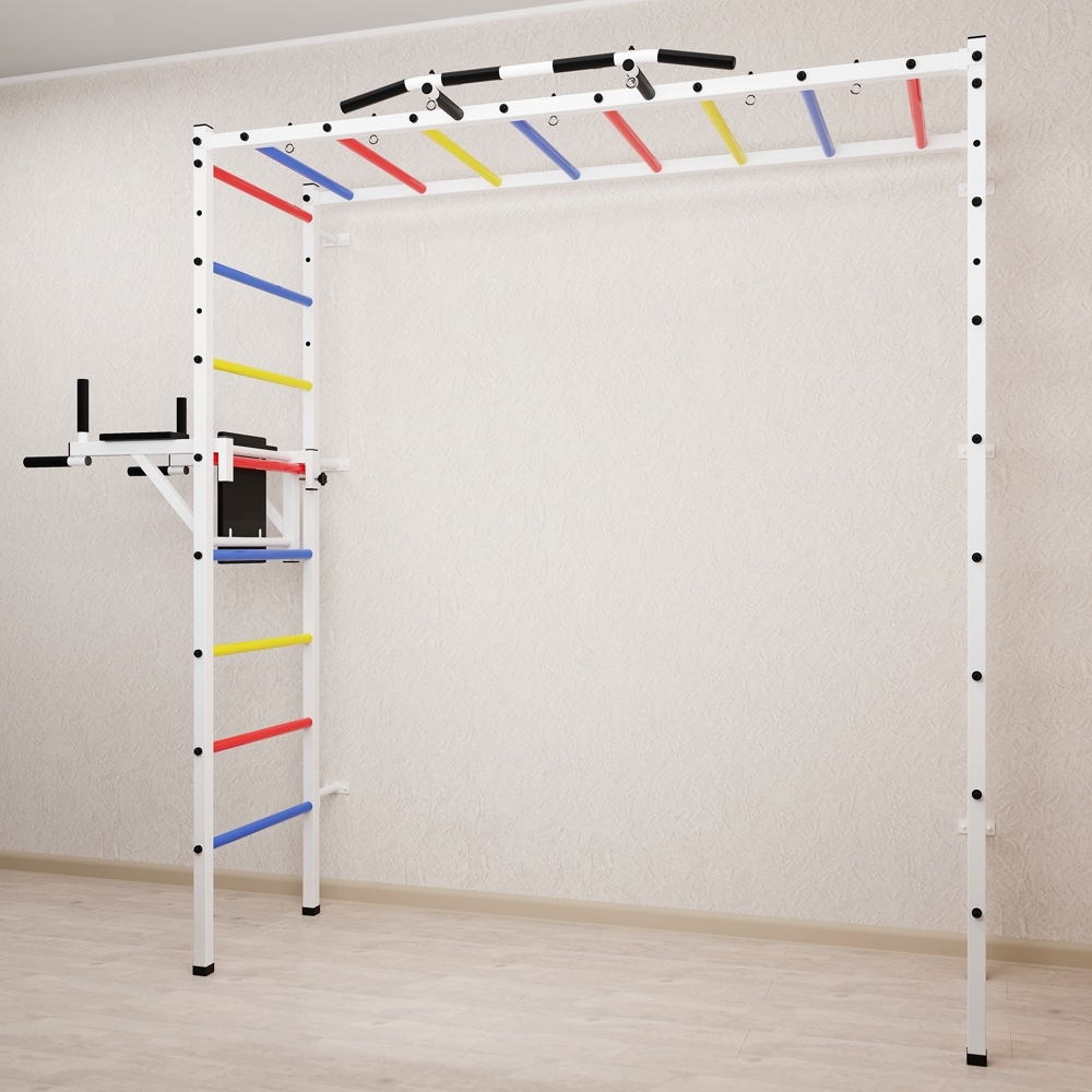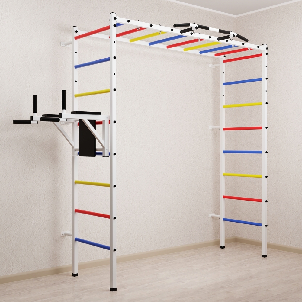 Основные характеристики: Максимально допустимая нагрузка 200 кг; Вылет брусьев от шведской стенки 68 см; Ширина креплений брусьев 54 см; Полимерная покраска; Резиновые ручки длина 16 см; Цвет покраски: белый; Гарантия 24 месяца.