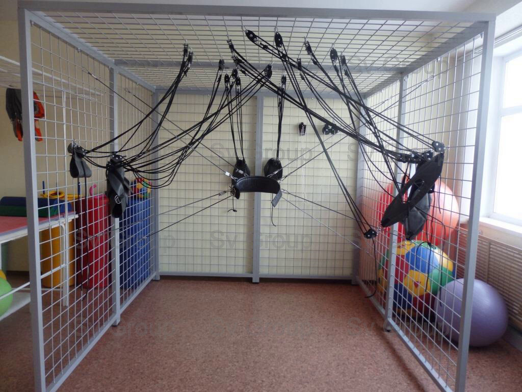 Реабилитационная система (клетка) "Паук" - это специальная подвесная система нагрузки опорно-двигательного аппарата для нормализации тонуса мышц и увеличения их силы, улучшения и развития координации движений.с помощью эластичных шнуров можно применять полное или частичное подвешивания пациента. Полное подвешивания пациента и нахождения в вертикальном положении способствует нагрузке опорно-двигательного аппарата для нормализации тонуса мышц. С уменьшением количества эластичных шнуров происходит частичное подвешивания пациента, которое приводит к увеличению нагрузки на нижние конечности и добавляет свободы для выполнения активных упражнений.